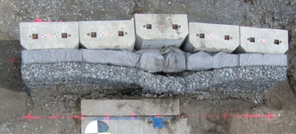 The gabion layers were substantially damaged during Test 6 (Figure 14). The rock and sand gabions deformed and had a reduced thickness; additionally the sand gabion would have undergone some compaction.