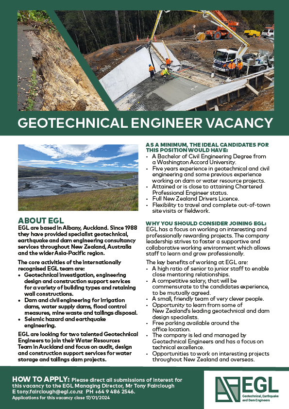 - liaise and collaborate with the other Technical Societies (SESOC and NZSEE) in New Zealand and internationally through our representatives (ISRM, ISSMGE and IAEG), and other professional organisations such as Engineering New Zealand and the Australian Geomechanics Society.