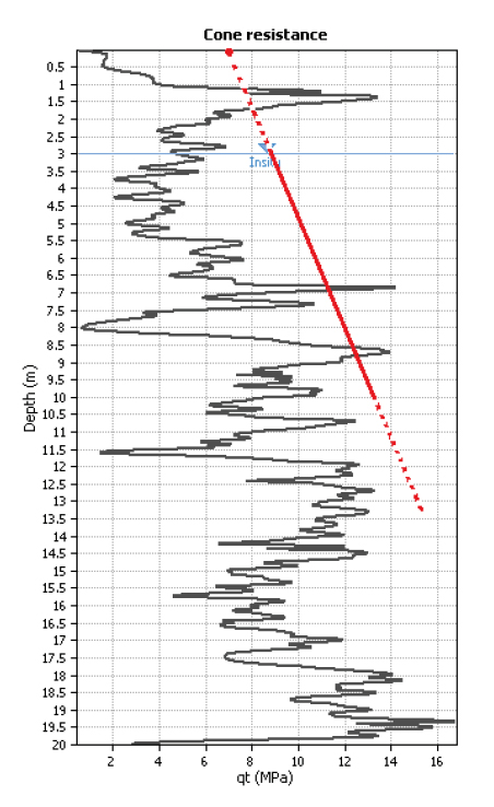 Cone penetration testing (CPT) is commonly employed for design and quality control (QC) purposes after ground improvement (Geologismiki, 2018). Within CLiq, this can be accomplished through the back calculation of the cone resistance profile, qc. tested from the site before treatment. Typical CPT113883 represented a worst scenario of settlement. The results of the back calculation for a single CPT profile under TC3 criteria by MBIE are presented in Figure 4. The design cone profile is highlighted in red, overlaying the measured cone profile in black.