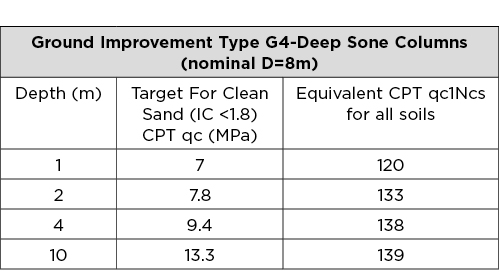 MBIE (2021) has provided guidance for testing ground improvement criteria for stone column technique as presented in Table 4. It can be used for initial design of SCR raft to improve the sandy soils to a resistance above a certain value. It is noted that the preliminary target CPT cone penetration values (qc) in Table 4 are only defined for sand, that means the sand soil should meet these requirements. It is not applicable to non-liquefiable soils, i.e., clay soil encountered in the ground. The CPT qc1Ncs values in the right column are defined for all kinds of soils. The normalized clean sand equivalent CPT tip resistance, qc1Ncs, is a function of the CPT tip resistance (qc), the groundwater depth (GWD), the fine content (FC) determined through laboratory testing, and soil density. It is a complex parameter and is not recommended for use in the initial design of an SCRR solution (Earthquake Commission New Zealand, 2015).