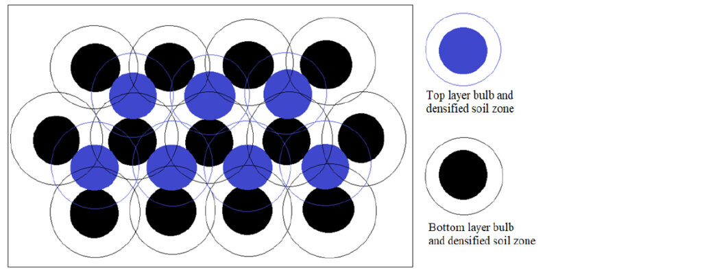 Each bulb in Figure 2 is encompassed by a surrounding zone of densified soil. According to the cavity expansion theory (Yu, 2000) and numerical modelling (Du and Xu, 2022), the annular layer of the densified soil possesses a thickness not less than the radius of the bulb.