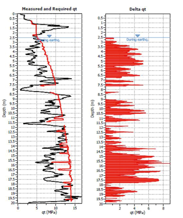 Figure 4: Back calculation of CPT113883 showing liquefiable layers in red (right) requiring improvement.