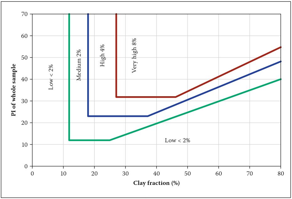 Two approaches are in common usage across the UK, a method based on the assessment of a ‘modified plasticity index (I’P) advanced by the Building Research Establishment (BRE), and a very similar ‘volume change potential’ classification advanced by the National House-Building Council (NHBC) which utilises the modified plasticity index.