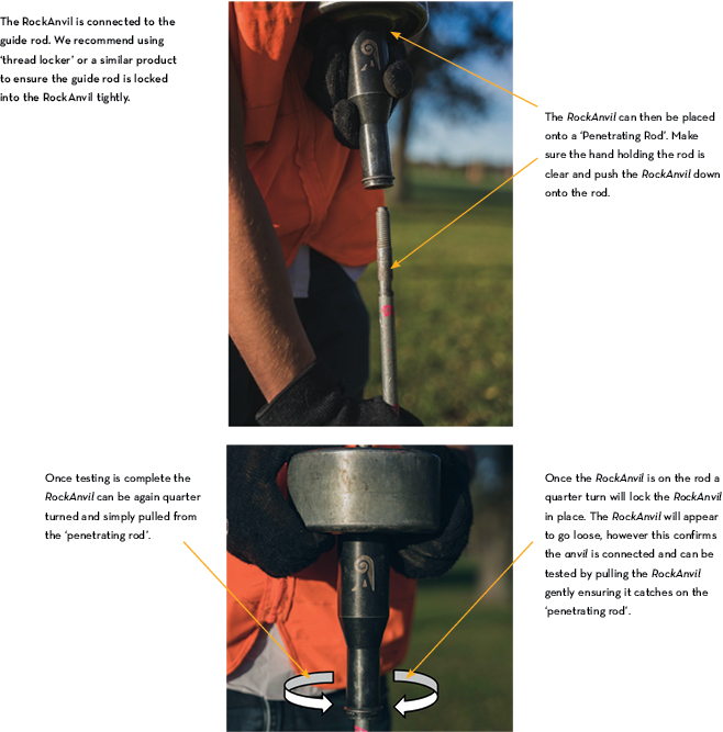 The RockAnvil solves the primary issues with the original Anvil. The ‘clip & twist’ locking mechanism is a fast and easy method for testing with multiple ‘penetrating rods’. This is because the anvil no longer needs to be screwed and un-screwed onto each rod and is instead simply pushed, twisted and pulled on and off each rod, significantly decreasing the time it takes to use this equipment. This also reduces any RSI’s associated with the threaded connection of the original anvil.