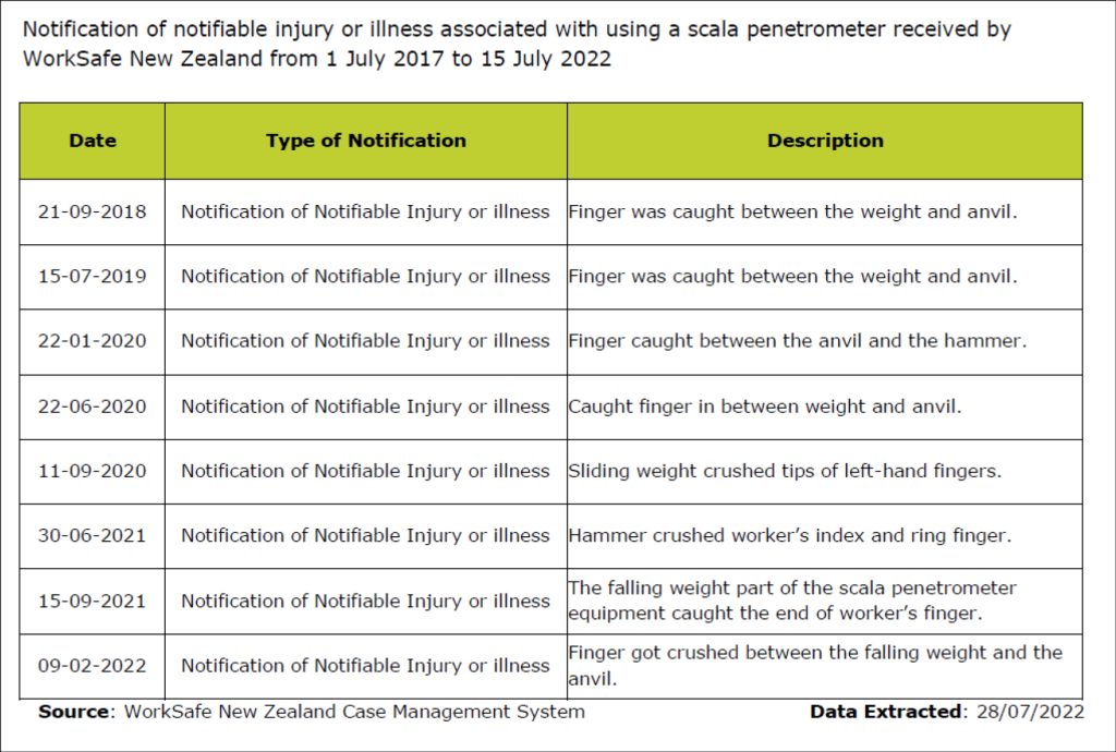 Figure 2: WorkSafe New Zealand Official Information Act Request – Notified Scala Penetrometer Injures