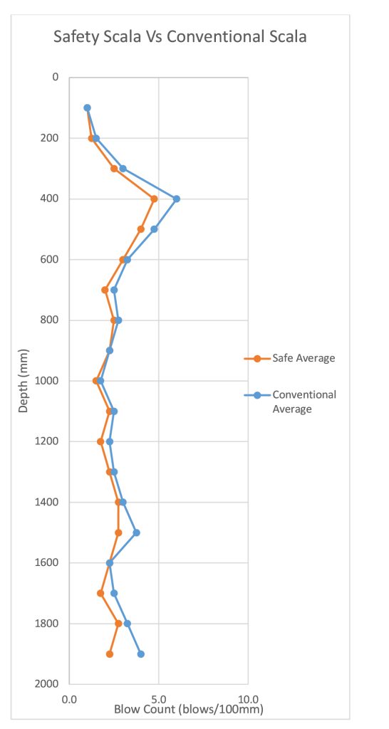 Testing was undertaken to compare the results of the Safety Scala to a conventional Scala Penetrometer in August 2022. The aim was to find out if there was any measurable difference in the two types of equipment. The testing was completed within Christchurch’s redzone near New Brighton and in close proximity to a borehole available on the NZGD that indicated the presence of medium dense SAND. A hand auger borehole was also completed at the testing which confirmed the underlying soil conditions to consist of sandy topsoil, reworked SAND and natural clean SAND of the Christchurch formation. Ten tests to a target depth of 1.9 m were completed with each device within a 2 m square.