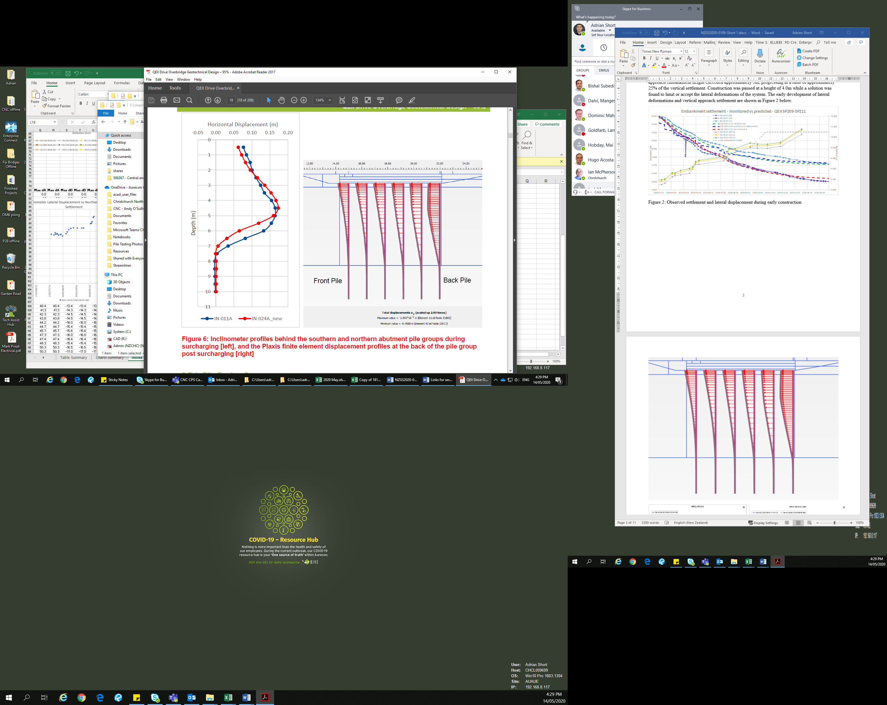 The design relied heavily on finite element modelling through Plaxis and RS2, which was able to closely match the observed behaviour and deformations of the system. In the authors view, there was no force-based technique that adequately captured the complex deformation pattern of the pile group or enabled meaningful predictions of the total deformation and pile actions. An elastic plastic finite element model was useful for showing the system behaviour, although to produce a closely matched back-analysis, and to predict the time dependent construction behaviour, a soft soil creep model was used for the detailed design.