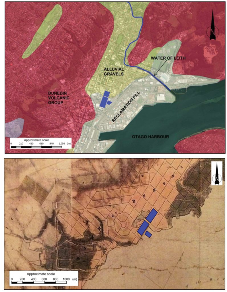 Figure 1 (1a, top image, site location overlain on Charles Kettle’s 1847 survey map of Dunedin; 1b, bottom image, site location overlain on published geological map, Bishop & Turnbull, 1996)