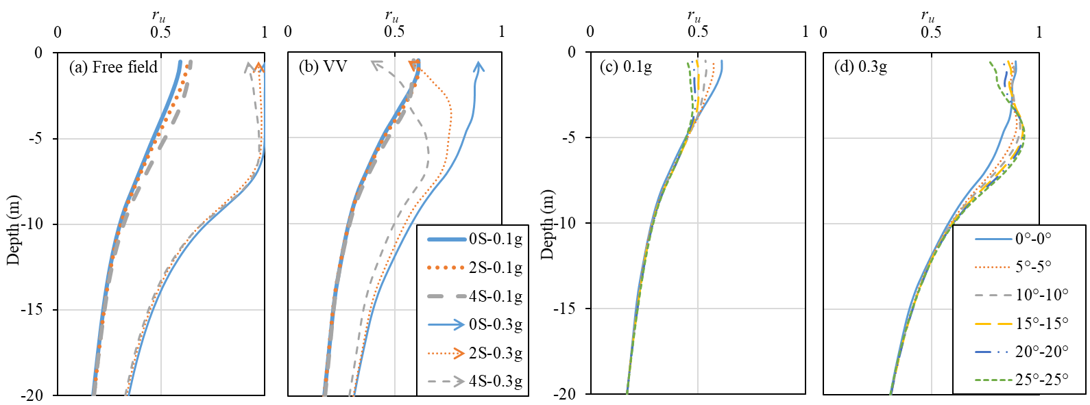 The distributions of the maximum ru in the free field and in cases with vertical piles are presented in Figures 2a and 2b, respectively. The ground slope and amplitude of the input motion are shown in the legends (e.g. “4S-0.3g” means β = 4° and amax,base = 0.3g). The depth indicated in the figures is measured from the ground surface. It can be seen from Figure 2a that soils above 6 m depth liquefy in cases with amax,base = 0.3g, although a slight reduction can be seen for steeper slopes. With amax,base = 0.1g, however, the soil deposit does not liquefy. Therefore, cases with amax,base = 0.1g are classified as “non-liquefied” cases, while the rests are “liquefied” cases. As presented in Figure 2b, the presence of vertical piles in liquefied cases reduce the maximum ru significantly, which can be attributed to the strengthening effects of pile groups on the soil.