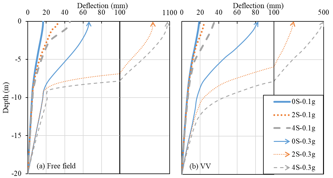 The maximum soil deflections in cases of the free ground and pile configuration VV are shown in Figure 3. Varying magnitudes of lateral deflection have been induced due to soil liquefaction. In Figure 3a, sharply increasing deflections can be observed at 8 m depth which is the interface of the two soil layers. With the presence of piles, the deflections near the interface, shown in Figure 3b, change gently with the depth. To investigate the influence of pile inclination, the performance index for soil deflection, PUsoil, is evaluated based on Equation 1 and illustrated in Figure 4. The pile inclination α represents αL, αR, and αL = αR for pile configurations IV, VI and II, respectively. Most indices are negative and decrease with the pile inclination, i.e. that the presence of the inclined piles reduces the soil deflection, with larger pile inclinations enhancing such beneficial effect. The indices in Figures 4b-4c are generally lower than those in Figure 4a, which indicates that inclined piles in sloping grounds have more pronounced beneficial effects than in the level ground. The beneficial effects of the configuration VI (PUsoil is down to -50%) are more pronounced than those of the configuration IV (PUsoil is down to -37%) but less pronounced than those of the configuration II (PUsoil is down to -60%). The soil deflection is mitigated by the inclined piles due to the larger lateral stiffness. Moreover, pile groups with one pile inclining in the upslope direction are more beneficial to the ground in terms of the soil response. Besides, indices for the liquefied cases are generally lower than in non-liquefied cases, showing that inclined piles have more pronounced beneficial effects when the soil liquefies.