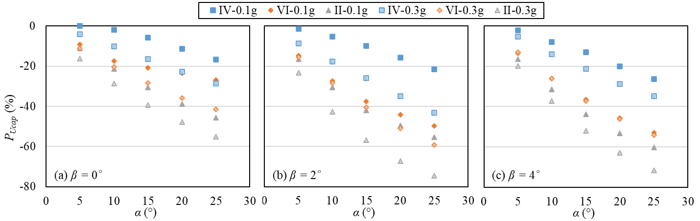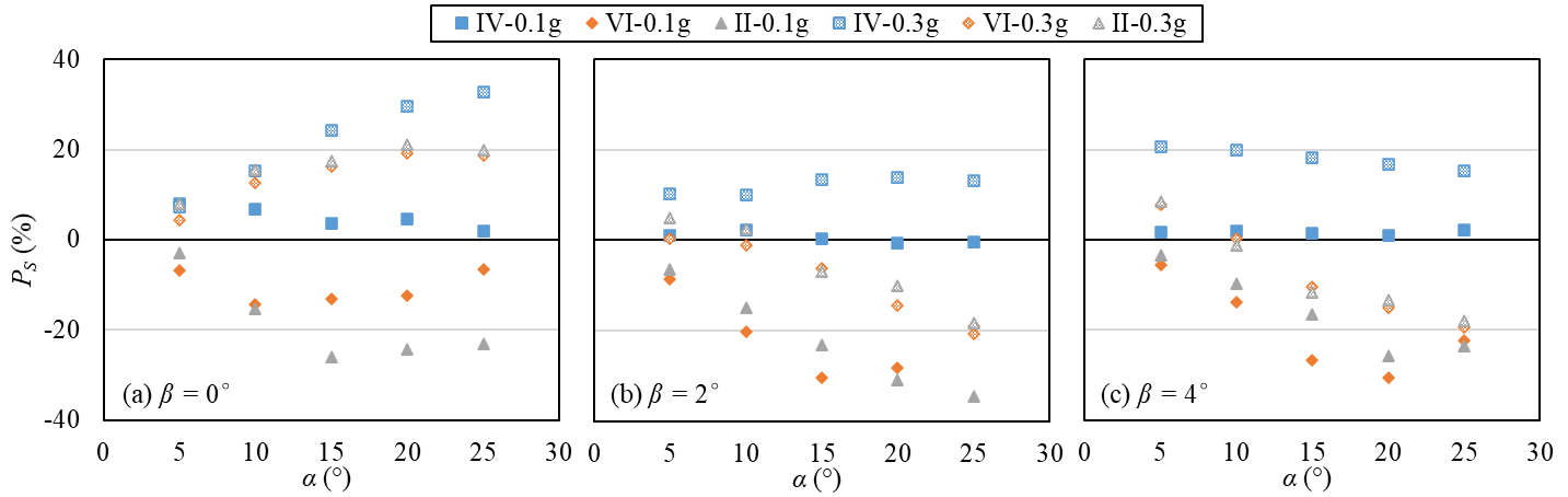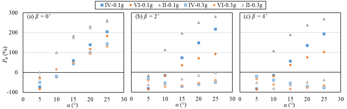 As shown in Figure 6, the cap rotation in the level ground (Fig. 6a) decreases for small pile inclinations (α < 10°). For example, indices for cases with α = 5° are down to -83%, while those for cases with α = 25° are up to 256%. It is noted that the use of inclined piles often induces considerable cap rotation, as indicated by Giannakou et al. (2010) and Li et al. (2016a). For the liquefied sloping ground cases, indices are negative, indicating a beneficial effect. The configurations IV and VI induce lower Pθ than the configuration II, with the exception of cases with α < 10° in liquefied sloping ground. This result indicates that a combination of vertical and inclined piles is generally better than the symmetrically-inclined pile groups in terms of the cap rotation.