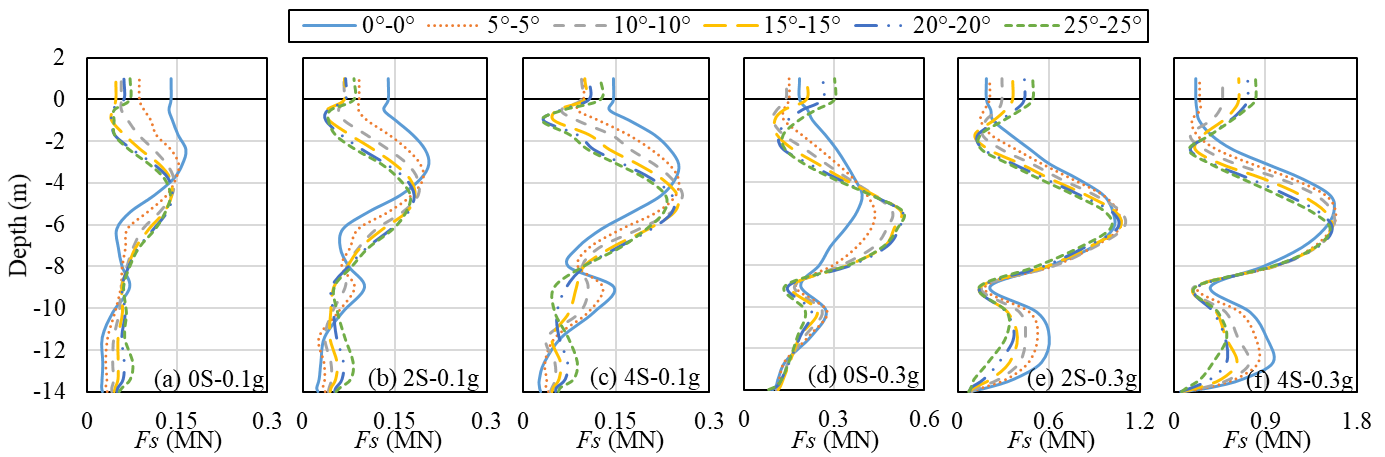 Figure 9 demonstrates the maximum shear force profiles for the left pile of configuration II. It is observed that the shear force profiles are amplified significantly with the increase in ground slope. Locations of the peak maximum shear force are generally in the lower part of the medium-dense soil layer. The pile inclination tends to enlarge the maximum shear force at the pile head and lower locations (e.g. at 4 – 8 m depth) in the liquefied cases (i.e. Figs 9d-9f) but tends to decrease those in the non-liquefied cases (i.e. Figs 9a-9c). It is worth noting that due to the adoption of a frictional interface between the pile tips and adjacent soil, the pile tips show non-zero shear forces although they have free ends.
