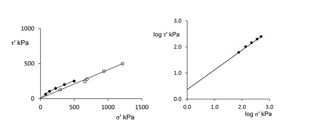 In the left hand diagrams in Figure 4 the constant volume critical state strengths are linear with arithmetic scales and conform to equation 2. In the right hand diagrams the peak state strengths are linear with logarithmic scales and conform to equation 4. Values for the parameters A and b in equation 4 and the constant volume friction angle ϕ’c in equation 2 are summarised in Table 1.