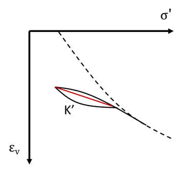 Fig 7(a) illustrates a typical stress – strain curve of soil in a drained shear test with an unloading – reloading cycle. The stress – strain curve for a drained triaxial test would be similar. The gradient is the shear modulus G’ and for a triaxial test it is Young’s modulus E’. Fig 7(b) illustrates a typical stress – strain curve of soil in isotropic compression with an unloading – reloading cycle. The curve for one-dimensional compression would be similar. The gradient of the isotropic loading stress – strain curve is the bulk modulus K’ and for one-dimensional loading it is M’ = 1/mv where mv is the 1D compressibility.