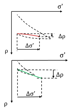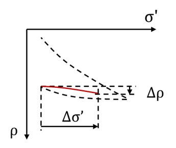 Stiffness is the relationship between changes of stress and changes of strain and stiffness modulus is the gradient of a stress- strain curve. These may be shear stress and strain giving a shear modulus G’ or mean stress and volumetric strain giving a bulk modulus K’ or a one-dimensional modulus M’. Figure 6(a) illustrates a general non-linear stress – strain curve. The stiffness at a point may be described as a tangent modulus δσ’/δε or as a secant modulus Δσ’/Δε.