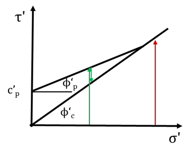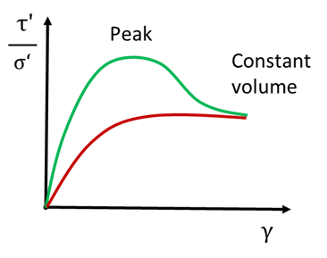 In Figure 1(a) a typical stress –strain curve for soil has a peak strength at a strain of the order of 1% and a smaller constant volume or critical state strength at a strain of the order of 10%. (Clay soils may also have a lower residual strength after very large deformations on a slip plane.) It is well established that all these strengths increase with effective normal stress and they are conventionally described by linear relationships as shown in Figure 1(b) so the peak strength is given by