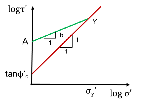 where A and b are parameters that depend on the soil grains and on the critical stress σ’y. This simple power law is similar to the basic formulation of the Hoek-Brown (1980) criterion commonly used to describe the strength of rock. A similar power law was found by Atkinson (2007) for peak strengths of several overconsolidated clays.