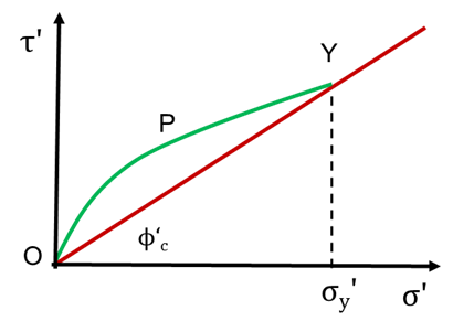 Figure 3(a) illustrates the features of the peak envelope from Figure 2. The effective stress strength is negligible when the effective normal stress is zero at the point O. It is impossible to make a stable vertical slope in dry sand. In plastic clays the strength at zero effective normal stress may not be exactly zero but careful experiments show that it is very small and only a few kiloPascals (Atkinson 2007). At relative large effective normal stresses beyond the point Y soils have no peak strength only a constant volume strength. Between O and Y there is a peak strength at P which is larger than the constant volume linear strength envelope. It is impossible for a linear peak strength envelope to join the points O – P – Y.