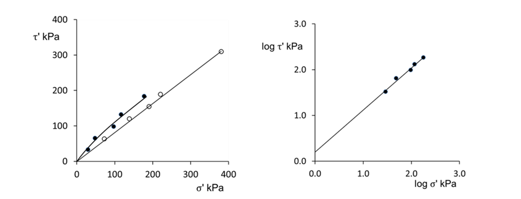 The data in Figures 4 show that the peak strength envelopes of several coarse and fine grained soils are non-linear. They all pass through or very close to the origin. These envelopes can be described by the simple power law in eqn 5 with the parameters given in Table 1. The large strain, constant volume, strengths of these soils are linear and are described by eqn 2 with zero cohesion and friction angles ϕ’c given in Table 1.