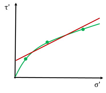 Figure 5 illustrates the errors implicit in the linear Mohr-Coulomb envelope. There are three data points obtained from a set of three triaxial or shear tests that define a non-linear failure curve and a linear Mohr-Coulomb envelope has been fitted through them. There is a mid-range of stress for which the soil strength is greater than that given by the linear Mohr-Coulomb criterion but at larger and smaller stresses the linear envelope is above the true curved envelope and it is unsafe. At small stresses relevant to stability of shallow landslides the errors using the linear Mohr-Coulomb envelope can be considerable (Atkinson, 2007, Atkinson and Crabb 1991).