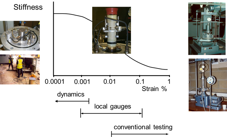 In conventional triaxial or oedometer tests there several sources of error in measurement of strain and it is impossible to obtain reliable measurements smaller than about 0.01%. To measure smaller strains it is necessary to use local gauges attached to the sample but these are limited to strains of about 0.001%. Soil stiffness at very small strain less than about 0.001% may be found from measurements of shear wave velocity in the ground or in laboratory samples.