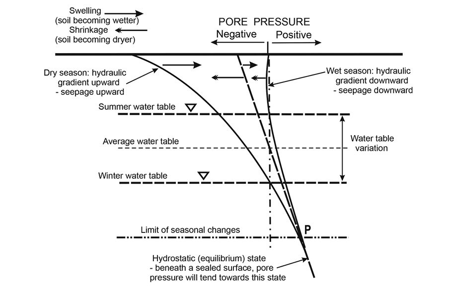 We need to recognise that clays can remain fully saturated for many metres or tens of metres above the water table, due to the combined effects of capillary forces and the very high air entry value of fine grained soils. Figure 4 also illustrates the possible changes in the pore pressure state due to seasonal changes. During a dry season, water will be drawn upwards towards the surface due to evaporation, and the probable pore pressure state resulting from this is indicated in Figure 4. During a wet season water will seep into the ground resulting the state also indicated in the figure.