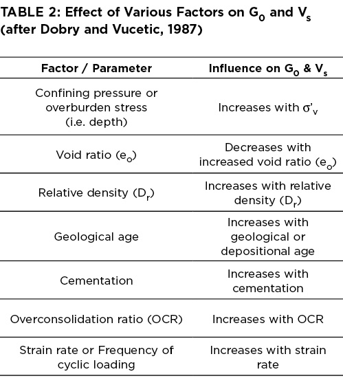 As Vs is dependent on the stiffness and density of a soil generally, as soil depth increases so too does stiffness, thus Vs also increases. Table 2 shows the dependency of Go and Vs on varying geological / geotechnical parameters.