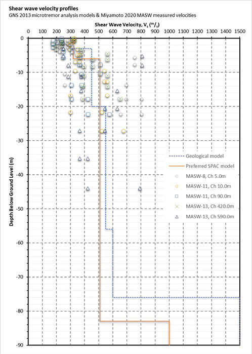 Figure 6: Vs Profiles – GNS 2013 Microtremor & Miyamoto 2020 MASW Surveys