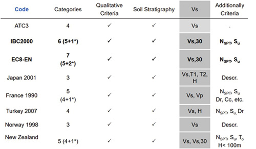Site characterisation schemes of the seismic codes use different descriptions of geological and geotechnical parameters to define soil classes.