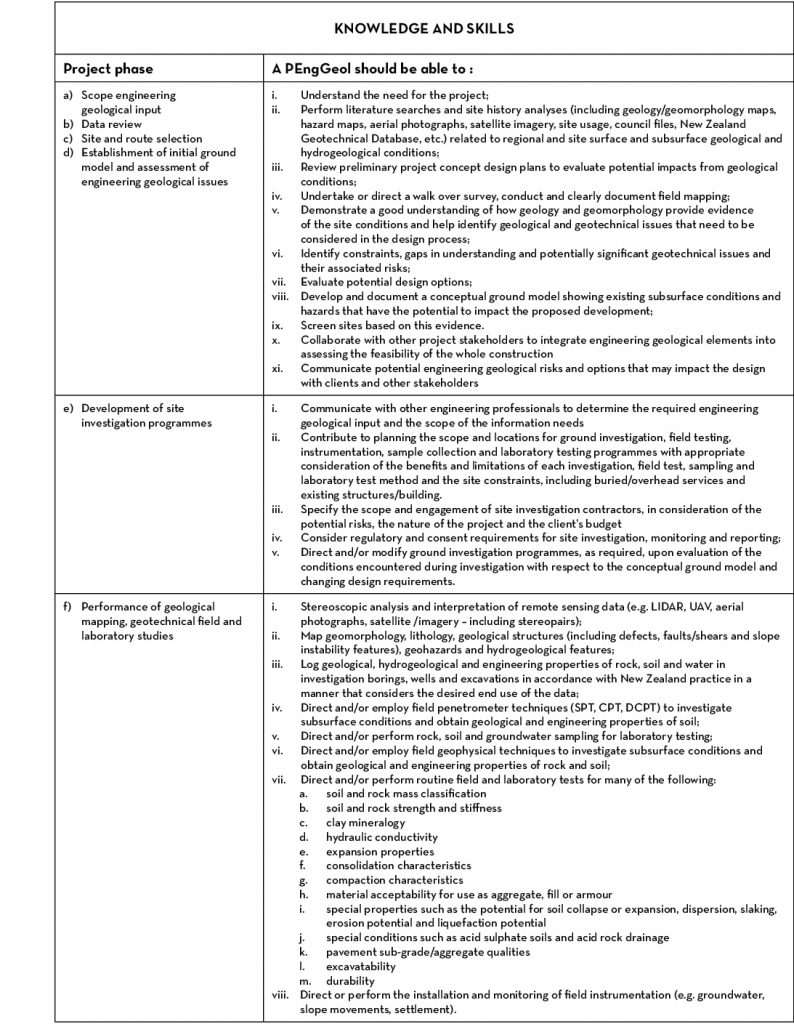 A PEngGeol is not expected to have all of the listed knowledge and skills. Rather they will have a broad range of them and in particular those relevant to their practice area. The knowledge and skills will be to a level sufficient to competently carry out the listed engineering geological problems and activities.