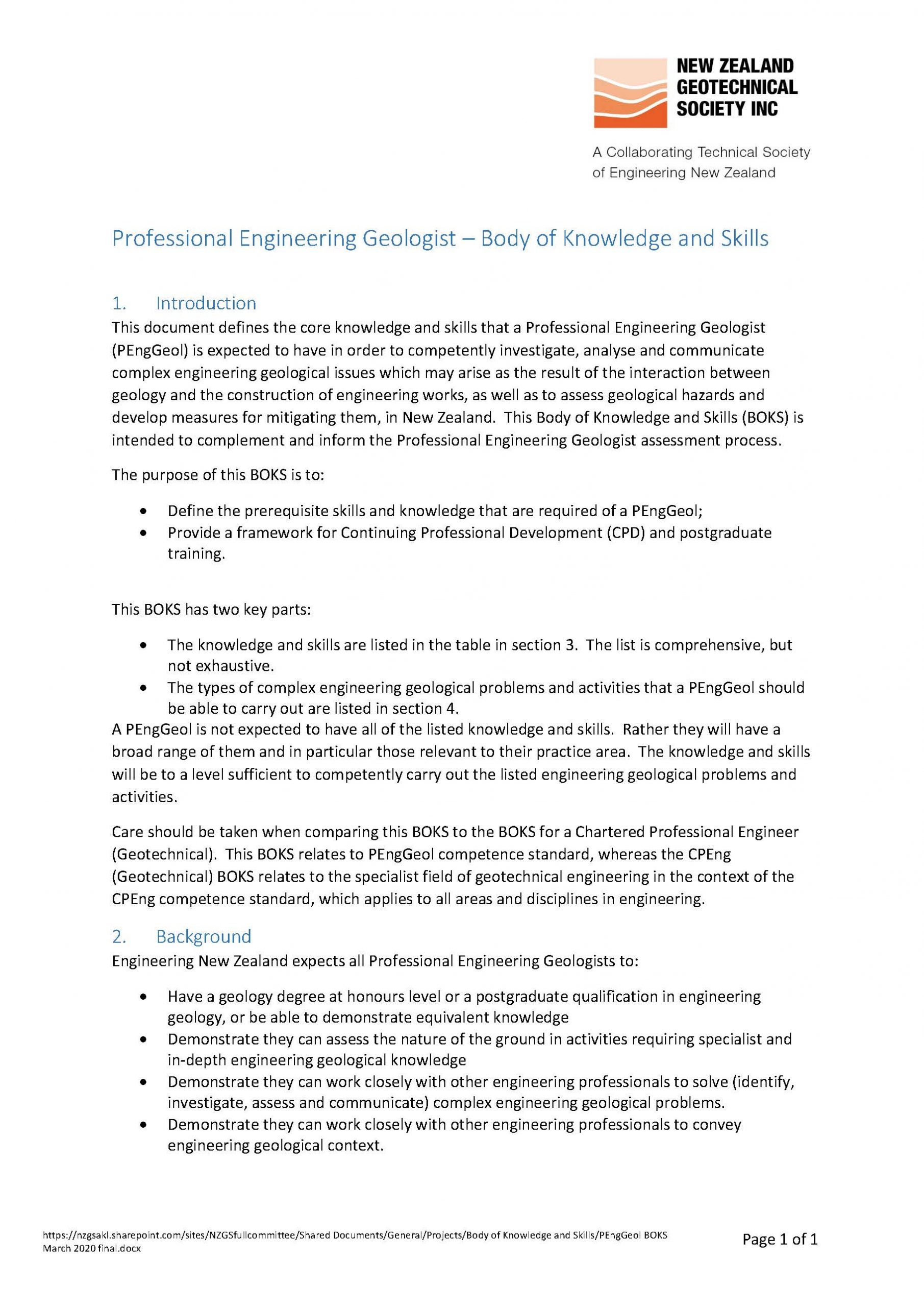 This document defines the core knowledge and skills that a Professional Engineering Geologist (PEngGeol) is expected to have in order to competently investigate, analyse and communicate complex engineering geological issues which may arise as the result of the interaction between geology and the construction of engineering works, as well as to assess geological hazards and develop measures for mitigating them, in New Zealand. This Body of Knowledge and Skills (BOKS) is intended to complement and inform the Professional Engineering Geologist assessment process.