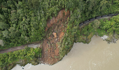 While tracking, along with projects that are part of the Rail Network Investment Programme and the recovery from the impact of ex-tropical Cyclone Gabrielle in various parts of the network, the KiwiRail Geotechnical Team have been busy with a large slip which occurred on Sunday 15 October following heavy rainfall in the Buller Gorge. The landslide engulfed the western end of Tunnel 3 on the West Coast’s Stillwater to Ngakawau Line (SNL).