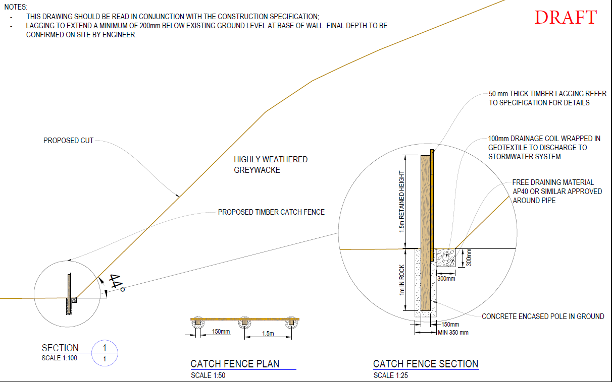 We recommended to our client that a catch fence should be constructed at the base of these cuts to reduce the likelihood of damaging rocks entering the residential properties below. We proposed a trial to establish if this fence would resist the demand energy for the specific site.