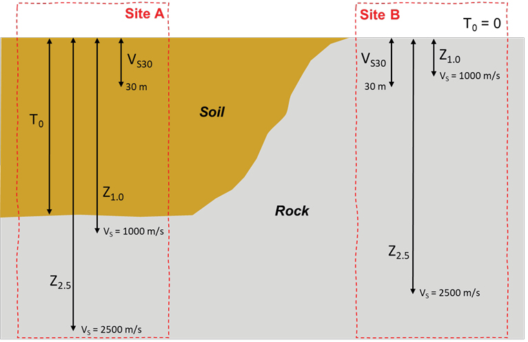 Schematic representations of a soil site (Site A) and a rock site (Site B) are presented in Figure 1, demonstrating the depth ranges that are characterised by each of these site classification metrics. VS30 represents the upper 30 m of the geologic profile regardless of the profile characteristics. The depth range represented by Z1.0 and Z2.5 will vary from site to site and will be dependent on the local profile characteristics. As depicted in Figure 1, these metrics represent a deeper profile at Site A compared to Site B due to the presence of the soil profile above rock. As there is no soil present at Site B, T0 is equal to zero seconds, with this metric not capturing the properties of any of the profile. At Site A, T0 is representative of the soil profile properties above the bedrock interface.