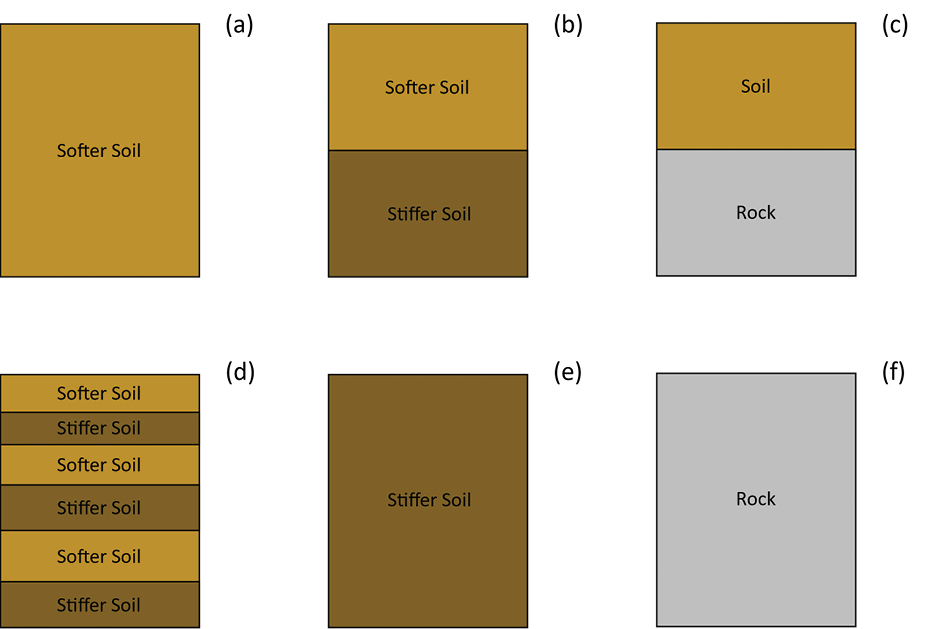 Figure 4 Simplified representations of general geologic profile characteristics that may be encountered: a) soft soils; b) soft soils overlying stiffer soils; c) soils overlying rock; d) interlayered profile of soft and stiff soils; e) stiff soils; f) rock.
