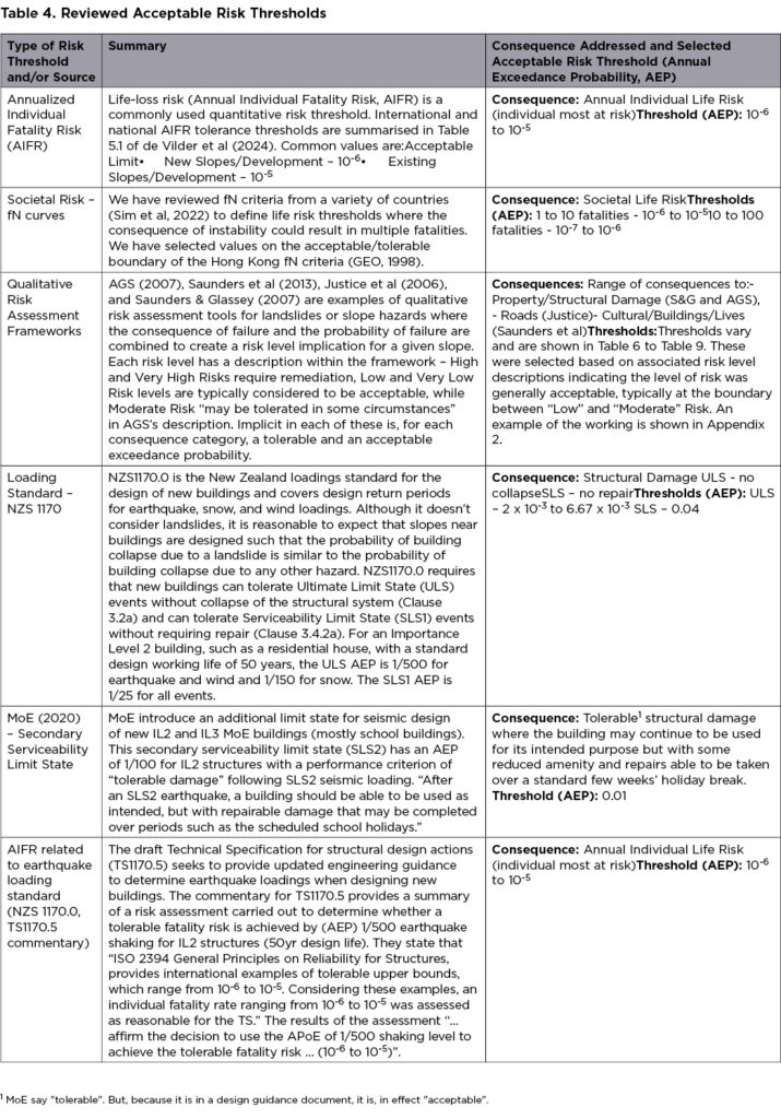 Arguably the most critical and difficult step in our approach is in developing threshold probabilities of failure for a range of consequence levels that broadly reflects generally accepted levels of slope stability risk within New Zealand. New Zealand has no regulatory framework setting out acceptable or tolerable risk, so we have turned to published guidance on risk acceptance used within New Zealand to develop risk thresholds. Defining acceptable or tolerable risk is a complex, context-specific task and as such, the applicability of the risk thresholds selected here should be considered on a project-by-project basis.