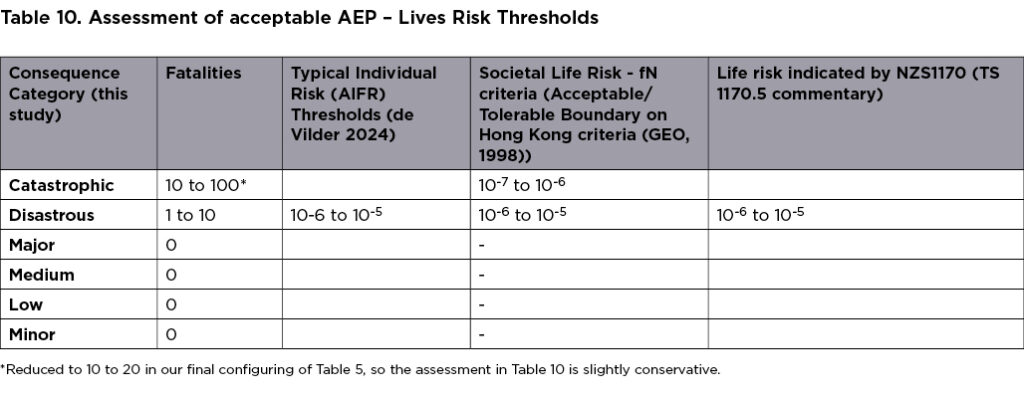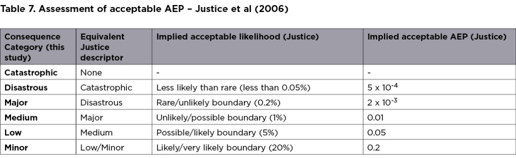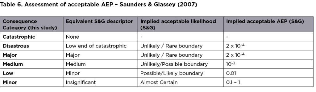 The measures of consequence under Saunders et al’s framework appear targeted toward area-wide assessments, not assessment of individual properties. Particularly, the level of risk associated with consequences that involve multiple fatalities is higher and not consistent with other reviewed frameworks. The AEP for the Catastrophic category from this framework appears unconservative and has been omitted. The AEPs in Table 6 to Table 11 were combined in Table 12.