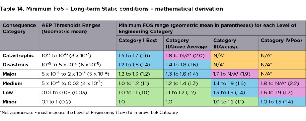 • Where the LoE is commensurate with the consequence (i.e. “better” engineering where the consequence is high), the indicated minimum FoS are broadly consistent with the typical value of 1.5 often adopted for the long-term static load case (the condition to which this table refers). This region is shaded blue in Table 14. This is a useful finding from our exercise as one goal was to determine the situations in which typical values are applicable. This trend indicates that if geoprofessionals match the level of investigation, design and oversight to the potential consequence of failure, the typical minimum FoS value of 1.5 likely reflects broadly accepted levels of risk. It appears that many geoprofessionals probably do this, as the value of 1.5 minimum FoS has been vetted, to a degree, through experience of the industry over time, and that experienced geoprofessionals instinctively match level of investigation to consequence.
