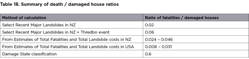 To allow a description of the number of damaged houses that matches the life risk for those categories that include fatalities, it is necessary to estimate the ratio of deaths to destroyed houses in landslides. We have reviewed several sources to establish a reasonable ratio of fatalities to destroyed houses and this review is described in Appendix 3. Owing to the high uncertainty in estimates of the ratio of deaths to destroyed houses and the paucity of research in this area we have allowed for the ratio to vary between 0.05 and 0.5.