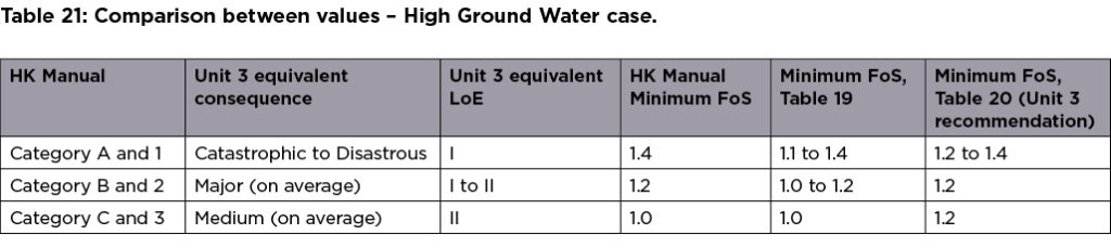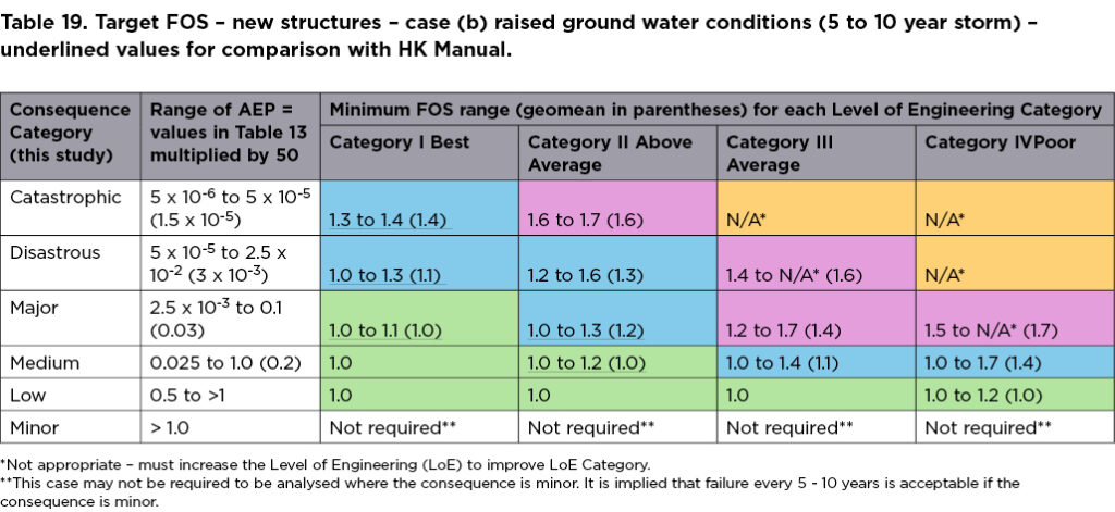 We assessed HK Manual’s Category A and 1 as being “Catastrophic” to “Disastrous” in this study’s terms, with the HK Manual providing a minimum FoS of 1.4 in a 10-year storm. Noting that the HK Manual appears to recommend LoE I to II, but that it would probably recommend LoE I for “Catastrophic” to “Disastrous”, then the equivalent target FoS in Table 19 is 1.1 to 1.4.
