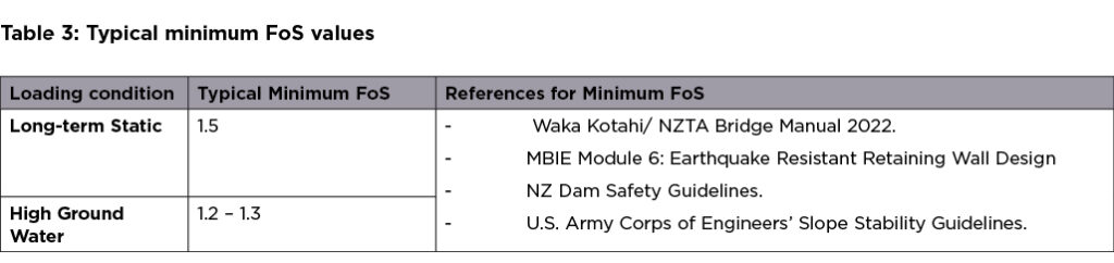 Recommended FoS for the High Ground Water case are shown in Table 2.