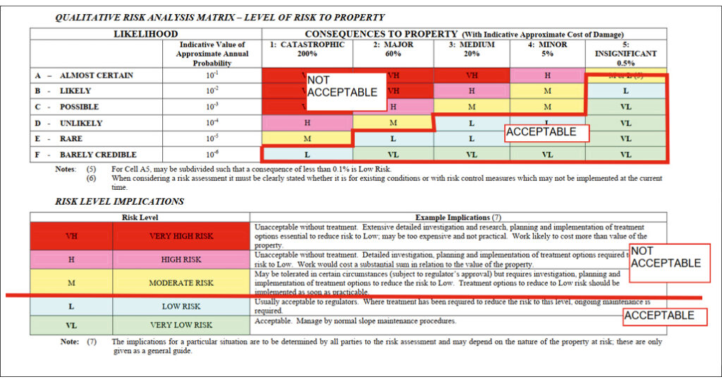“Tolerable” and “Acceptable” risks have been defined by AGS (2007), amongst others. Several risk thresholds have been reviewed to develop ranges of generally accepted values of “acceptable” risk for a variety of consequence categories as summarised in Table 4.