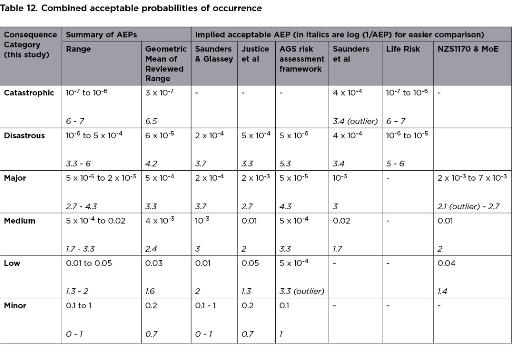 The Geometric mean values can be thought of as the mean value of the log (1/AEP) – the values in italics – and then converted back to AEP. The following outliers were disregarded in the calculation: (1) The AEP from Saunders et al associated with the Catastrophic consequence category (2) the AEP from AGS associated with the Low consequence category (3) AEP from NZS1170 associated with Major consequence related to snow loading.