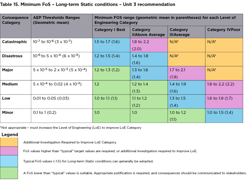 As for the Long-term Static Conditions case, it was considered prudent to have FoS values no lower than 1.2 for Medium (and worse) consequence situations. Table 19 was thus adjusted, with the following Table 20 used for Unit 3 (and is a duplicate of Table 2 in this paper, but with colours and AEP).