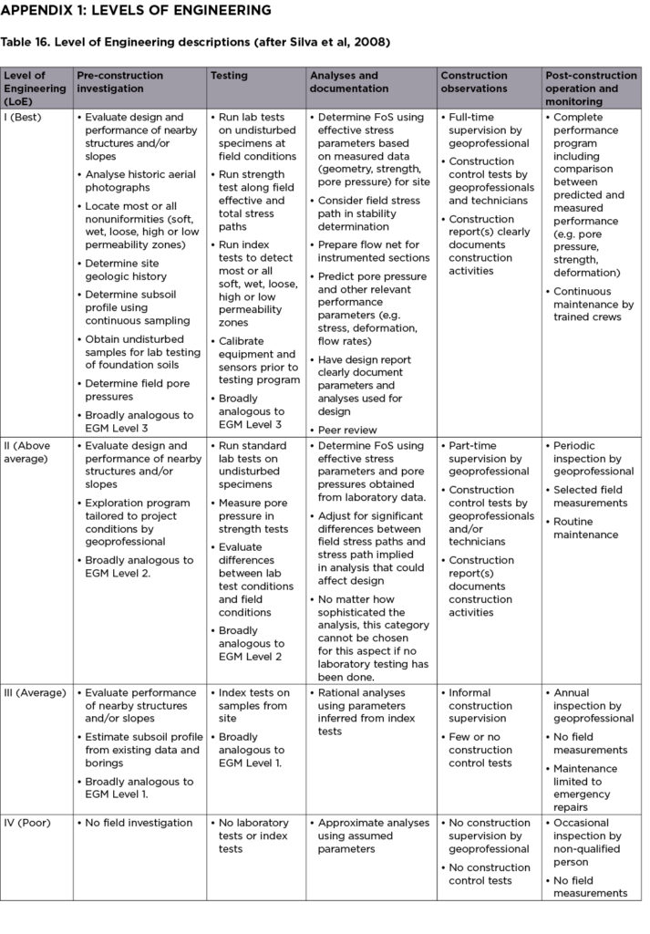 The Level of Engineering is described by categories, with LoE I being the “best” and features, amongst many other things, continuous sampling during investigations, laboratory testing on undisturbed specimens, a peer review of analysis, full-time engineering supervision during construction, and operations and maintenance after construction.