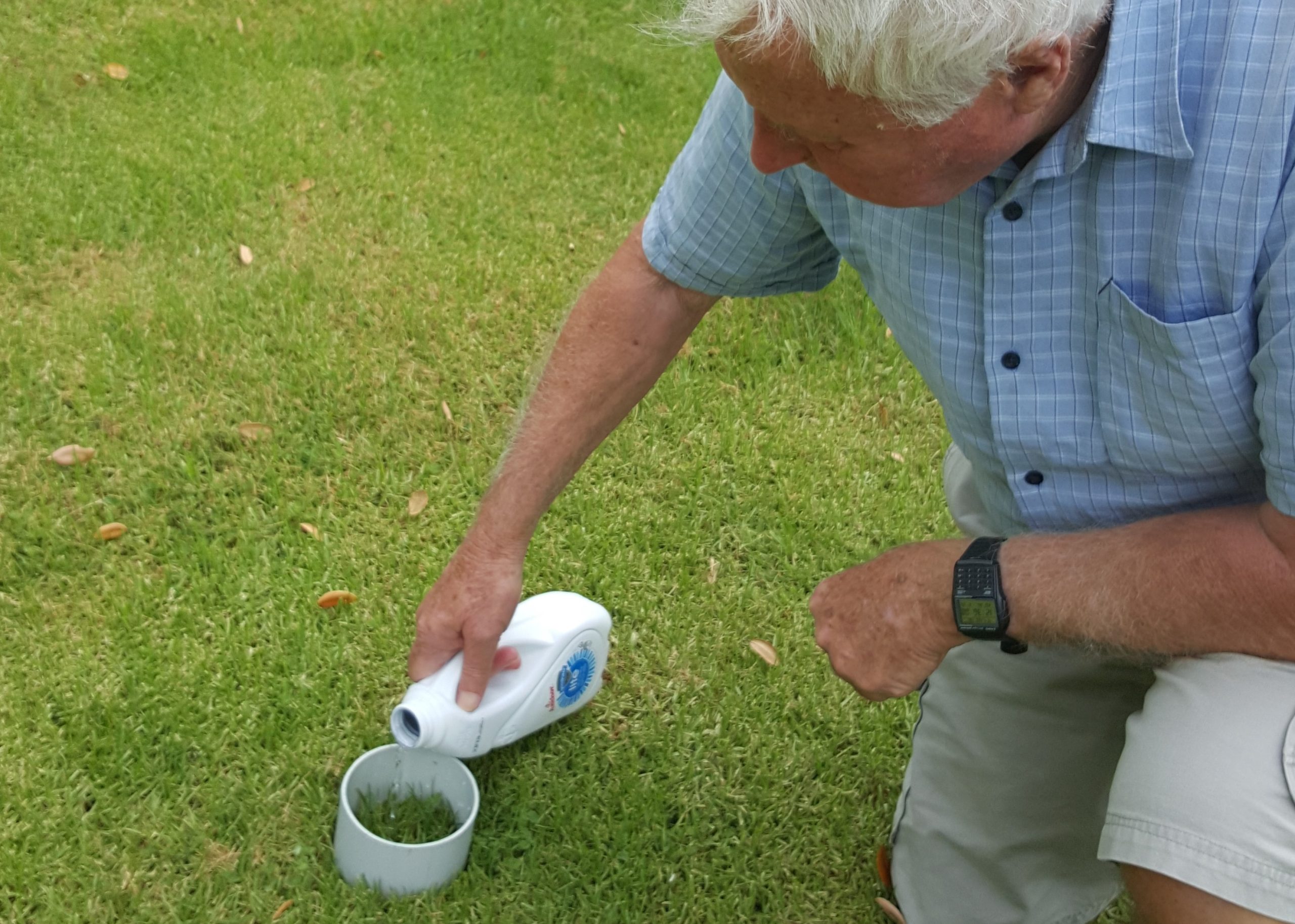 An obvious feature of the ground which was about to be urbanised at Mangawhai was the absence of scour by overland flow on the roadside drainage channel on Molesworth Drive. This suggested that the sand had an MIR higher than the maximum precipitation rate. This suspicion led to testing with an improvised infiltrometer (Fig 2) comprising a short length of plastic down-pipe and a one-litre milk bottle. By measuring how long it took for the circular area of soil surface defined by the pipe to take in a litre of water, measurements of MIR were obtained. (The pipe was pushed one or two millimetres into the soil to ensure all flow began as vertical flow, and the lower end of the pipe was sharpened to allow it to be pushed in easily.)