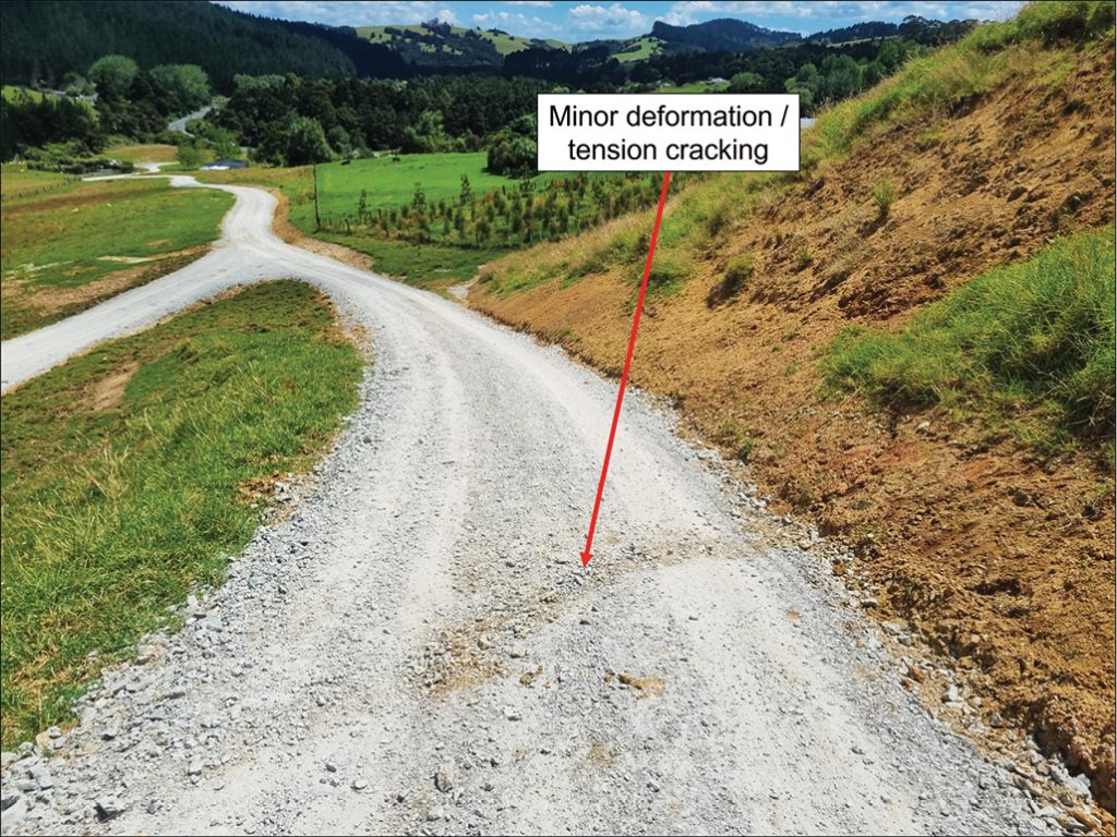Initial observations were made of relatively small-scale deformation / tension cracking (both vertical and horizontal displacement in the order of 20-30mm) through a portion of gravelled driveway (refer Figure 1). These initial observations were made on 20 January 2023, immediately preceding the events of 27 January 2023. Based on anecdotal evidence from the property owner, it was surmised that the cause of the cracking was likely resultant from intensive surface water runoff, rather than a more ‘global-scale’ movement of the wider hillside.