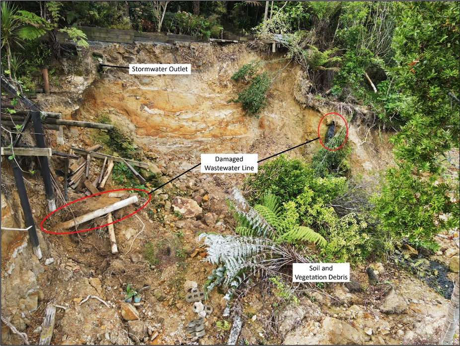 Figure 5 shows a drone photograph taken several days after ground movement was observed at this property following the significant rainfall events. Overland surface water flows from the road, and a high groundwater table were the likely triggering mechanisms for the failures on the moderately graded soil slopes.