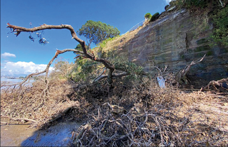 Instability was observed within the Miocene aged flysch deposits exposed along Auckland’s eastern coastline at a number of locations following the heavy rainfall events. These materials can be highly susceptible to erosion and movement, particularly following storm events when concentrated water flows from the surface or stormwater outlets discharge directly over or onto the cliff face. This can lead to direct erosion of the materials, and / or saturation of the soil mantle which slides over the underlying rock mass. High wind loading on mature trees in these saturated conditions during or after the heavy rainfall events has also been observed to be a contributing factor to some of these failures where large volumes of soil and rock materials can be pulled out within the root systems when the tree falls.