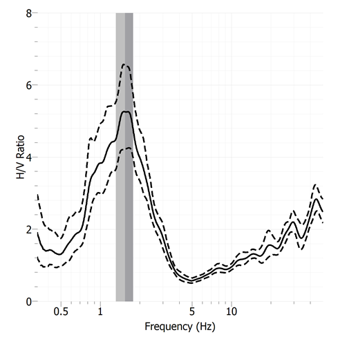 A peak in the H/V spectra indicates an impedance contrast between materials associated with that frequency. It is possible to have multiple impedance contrasts corresponding to interfaces between soil layers above the rock, for example between a soft clay and a dense sand. In such cases the lowest frequency peak is taken as the fundamental site frequency. The SESAME 2004 guidelines provide criteria for identification of a clear frequency peak to allow the user to assess the reliability of the indicated resonant frequency. Once the resonant frequency of the site is defined, the site period can be determined by